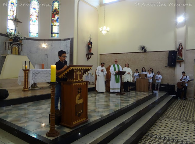 As crianças da Catequese Paroquial apresentaram as leituras e salmos do dia e o Grupo Encantando Jesus animou a celebração com seus cânticos.